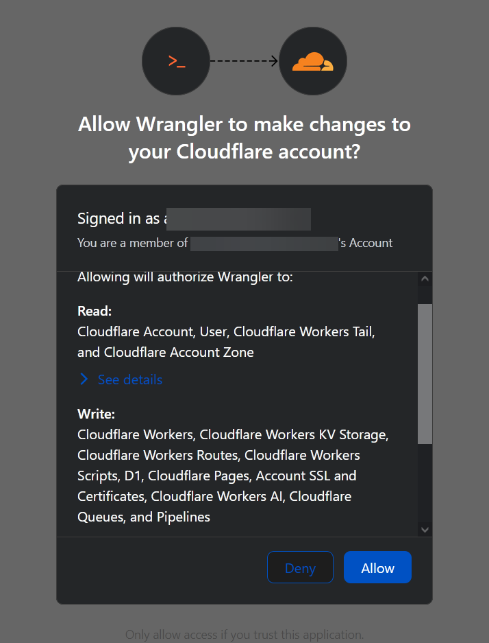 Once logged in, the prompt for the authorisation of wrangler is presented: