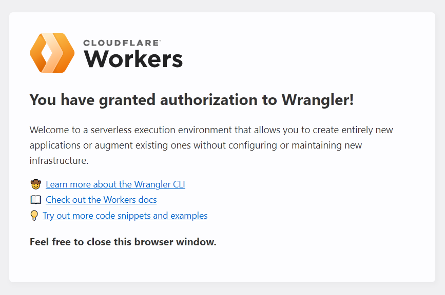 We can now deploy to Cloudflare, however note the prompts at the bottom. The first is to get an authentication key for wrangler via the browser.